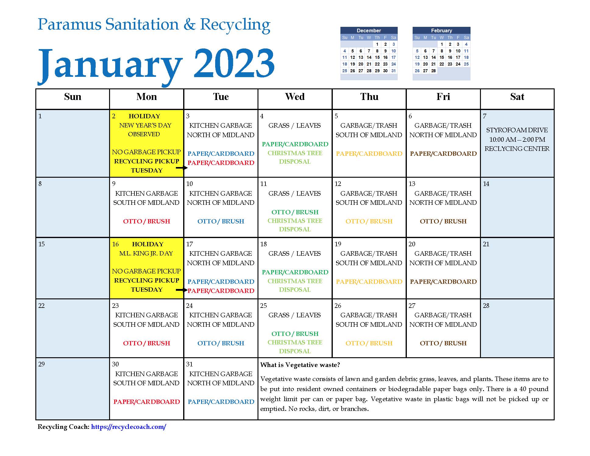[ARCHIVED] 2023 Paramus Sanitation/Recycling Collection Calendar January